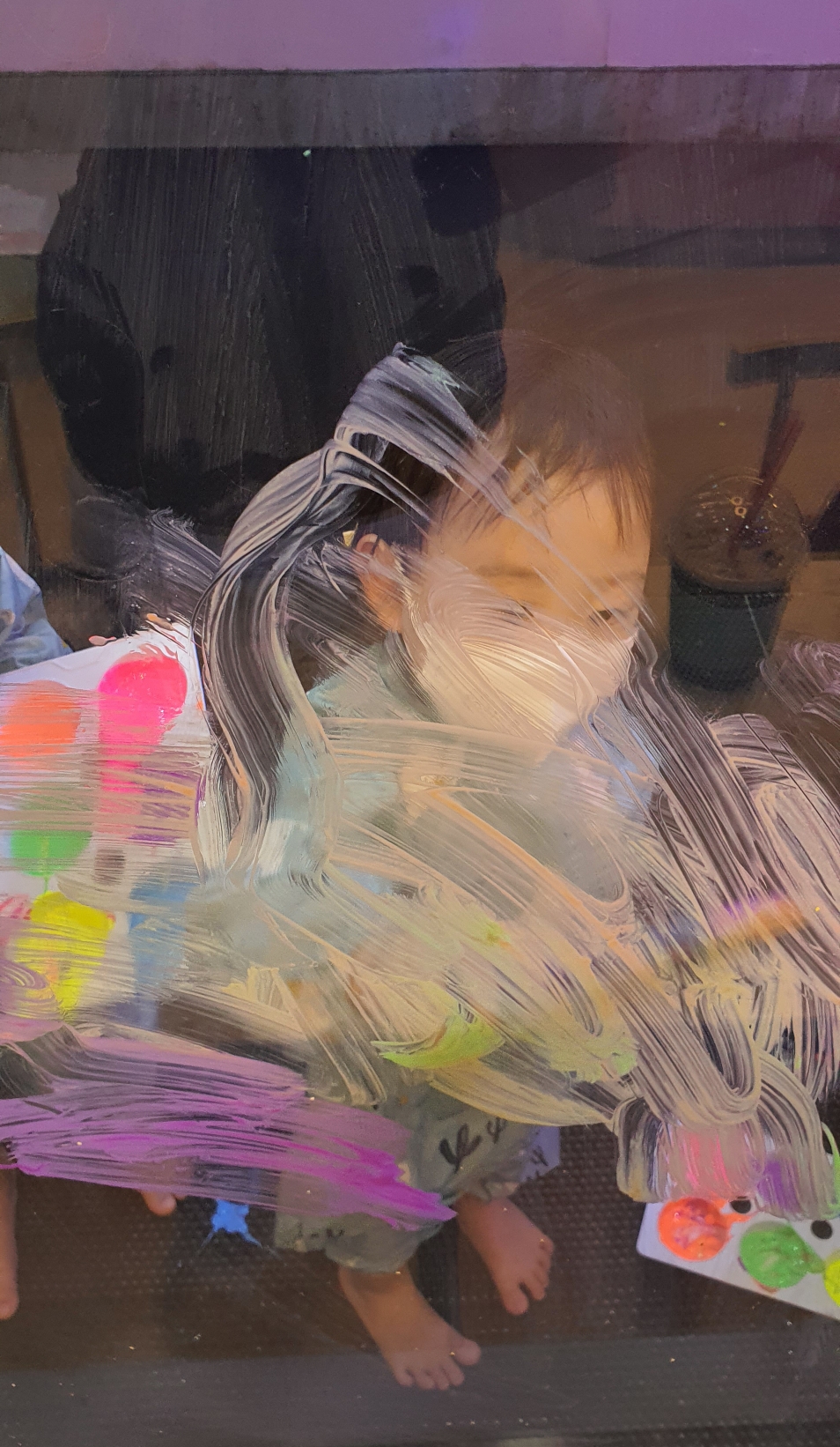 창 밖에 엄마 얼굴이 보이니 붓으로 엄마 얼굴에 칠하는 시늉도 해보고 거품도 뿌리며